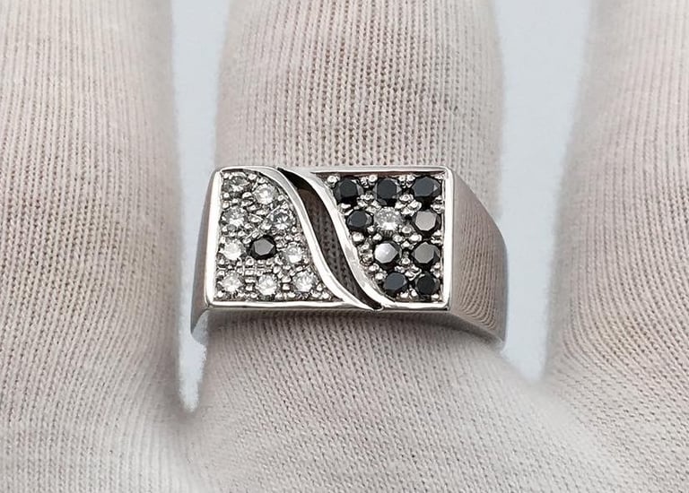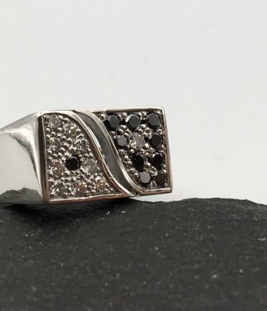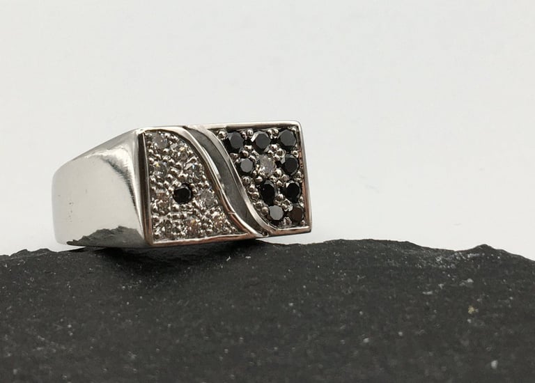 Dieser außergewöhnliche Ring aus edlem Weißgold greift das Symbol von Yin und Yang auf – nicht in klassisch runder, sondern in moderner, eckiger Form.