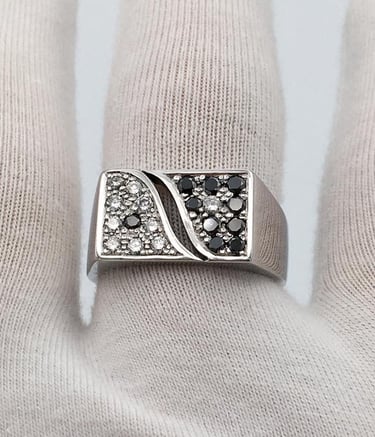 Mit funkelnden weißen und tiefschwarzen Diamanten entsteht ein abstraktes, kraftvolles Spiel zwischen Licht und Dunkel, Gut und Böse, Ruhe und Energie. Die beiden Gegensätze verschmelzen zu einer harmonischen Einheit – elegant eingefasst in klarem Design und hochwertiger Handwerkskunst.