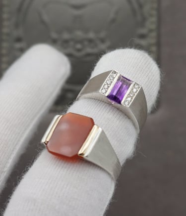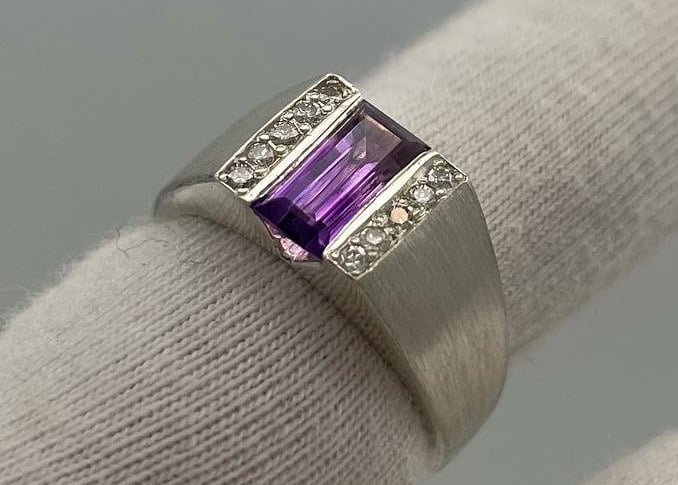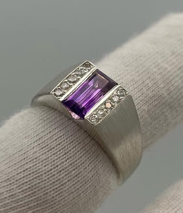 Bei diesem einzigartigen Ring steht der rechteckige Edelstein ganz im Fokus. Seitlich gefasst und nicht wie gewöhnlich von oben umrahmt, schwebt der Stein förmlich im Zentrum des Designs – elegant, modern und mit klarer Präsenz.