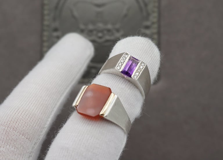 Beim kleineren Ring wurde zusätzlich eine feine Reihe seitlich gefasster Diamanten eingearbeitet, um dem Design eine noch edleren Note zu verleihen.