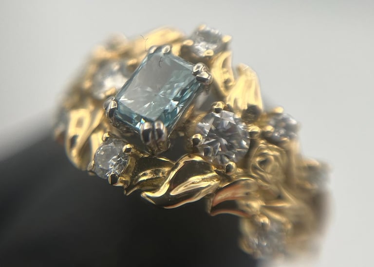 Der restliche Ring ist in warmem Gelbgold gefertigt und erinnert an den goldenen Sand eines Strandes. Kleine Diamanten funkeln wie Lichtreflexe im Sand, während zarte Blattelemente das Gefühl von Natur und Leichtigkeit unterstreichen.